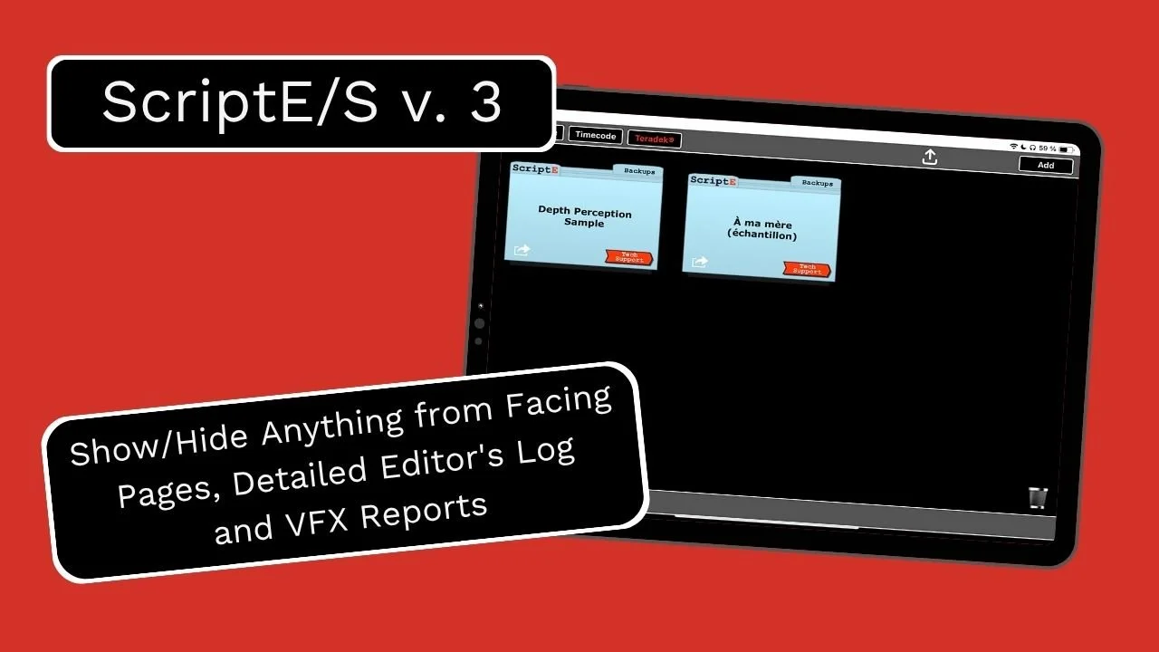 ScriptE for iPad: Show/Hide Anything from Facing Pages, Detailed Editor's Log and VFX Reports
