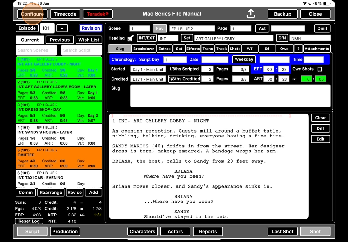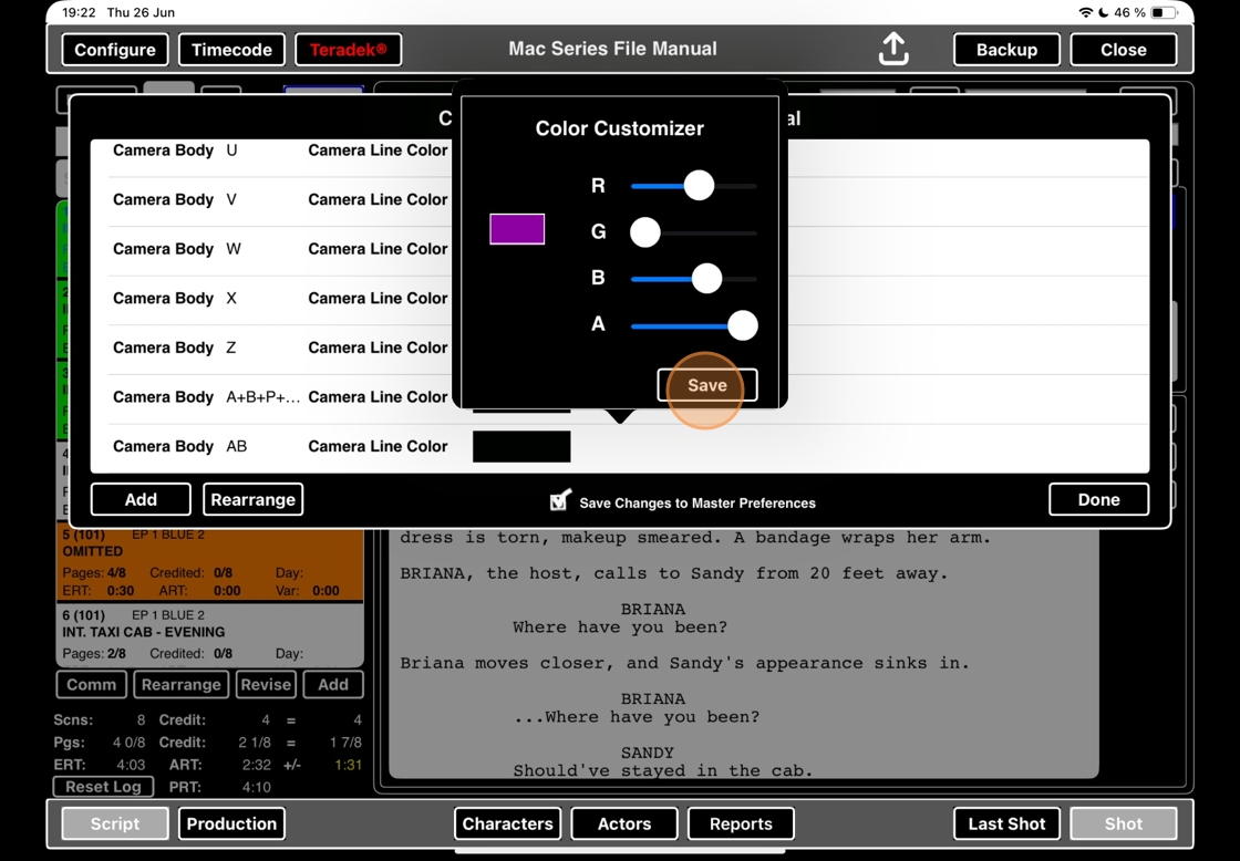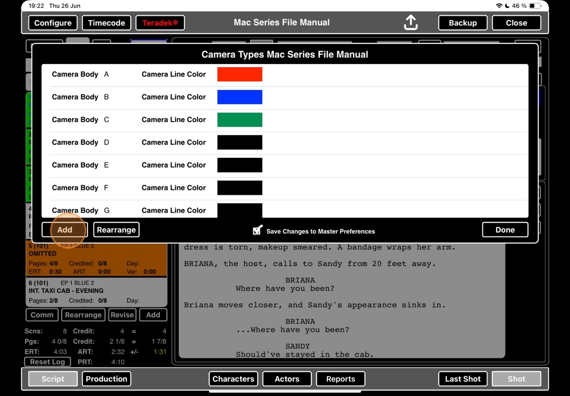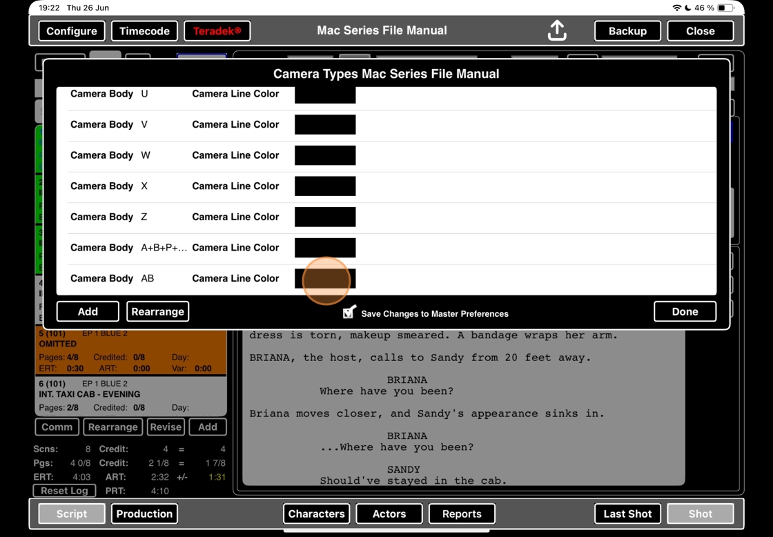 8. Now, the line for this camera will get this color on the lined script. Click the close button to dismiss the camera types menu.