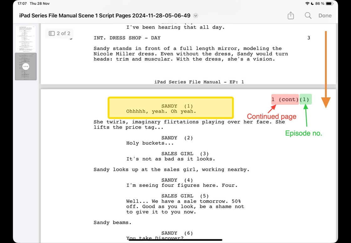 10. If you have too many paragraphs on the same page, ScriptE will print continued pages.