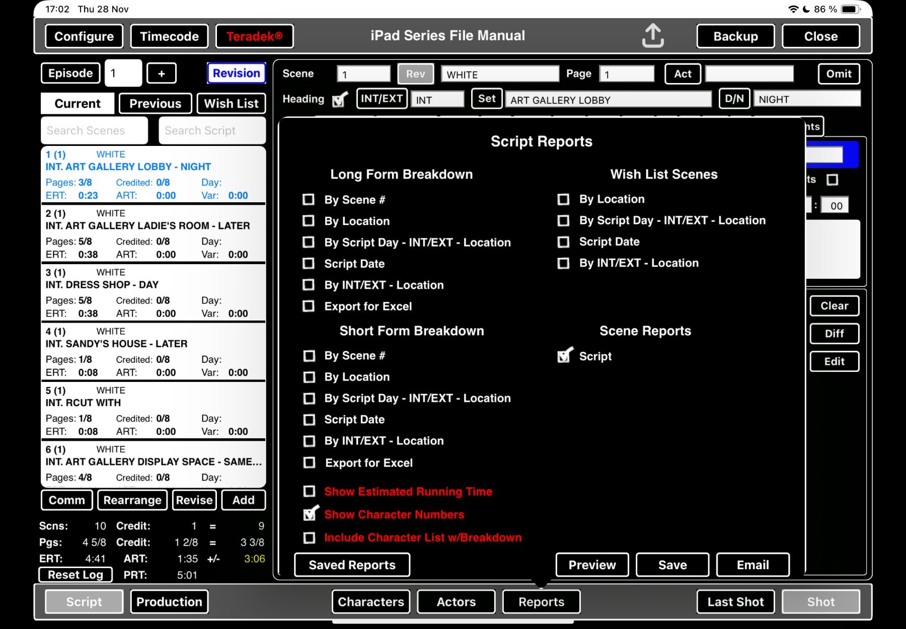 12. Under SCENE REPORTS, select SCRIPT