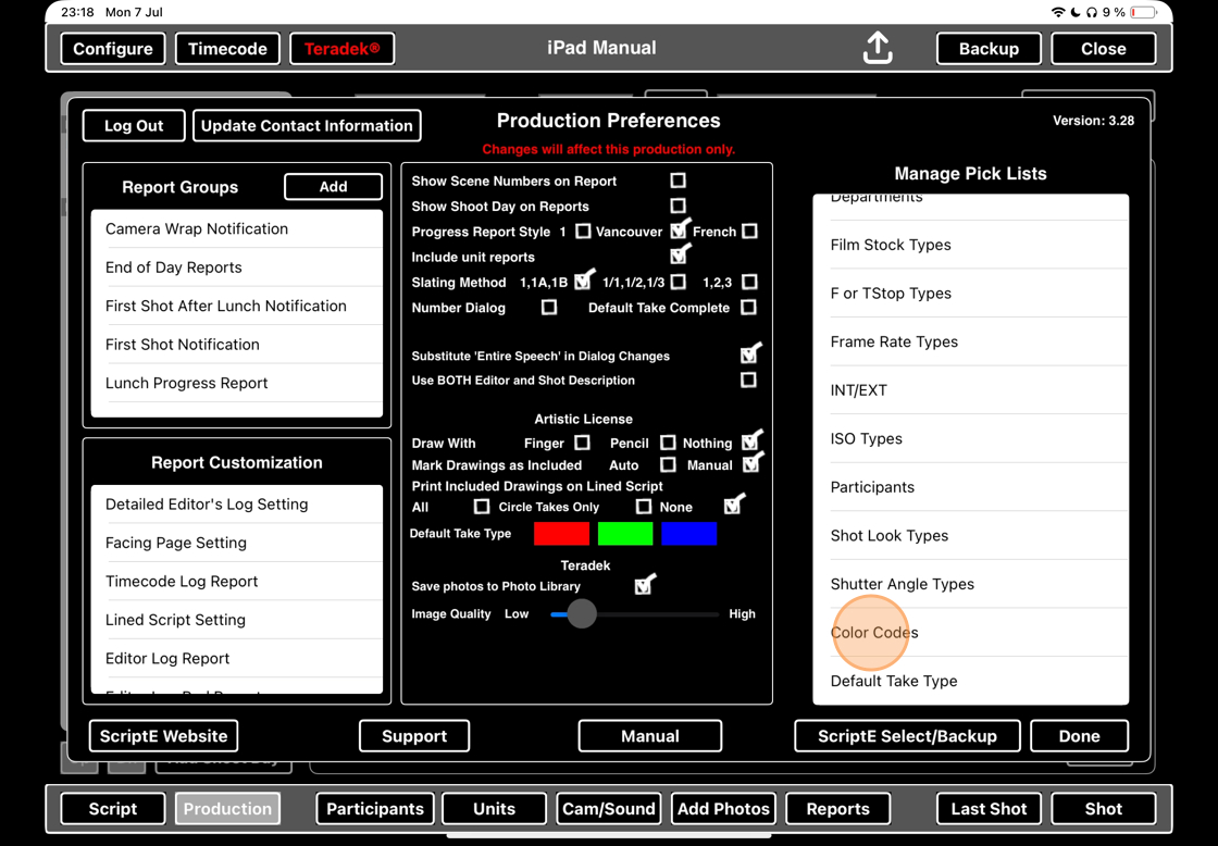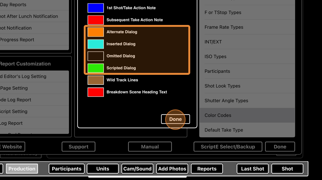 5. In the COLOR CODES BOX, click on the color blocks for ALTERNATE DIALOG, INSERTED DIALOG and OMITTED DIALOG respectively to open color toggles that allow you to selec colors you like.