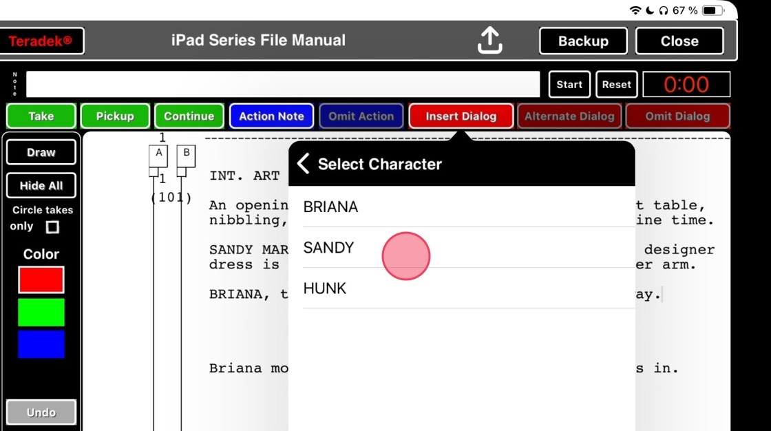 8. Select the character you want to add the dialog for (note that you can´t insert dialog for a character if you have placed the cursor in a dialog element already belonging to that character)