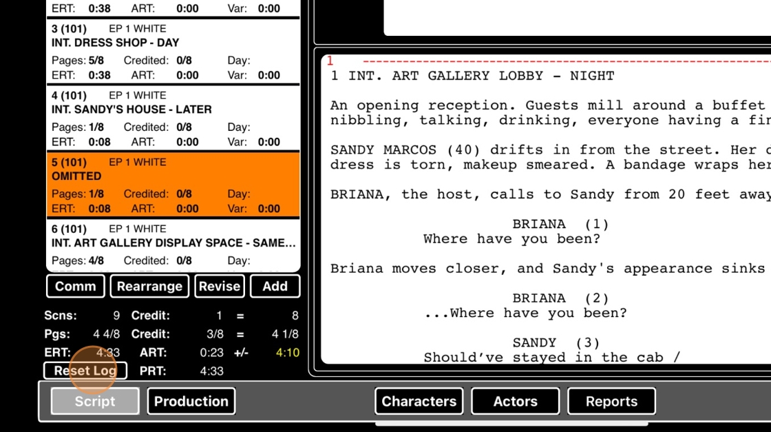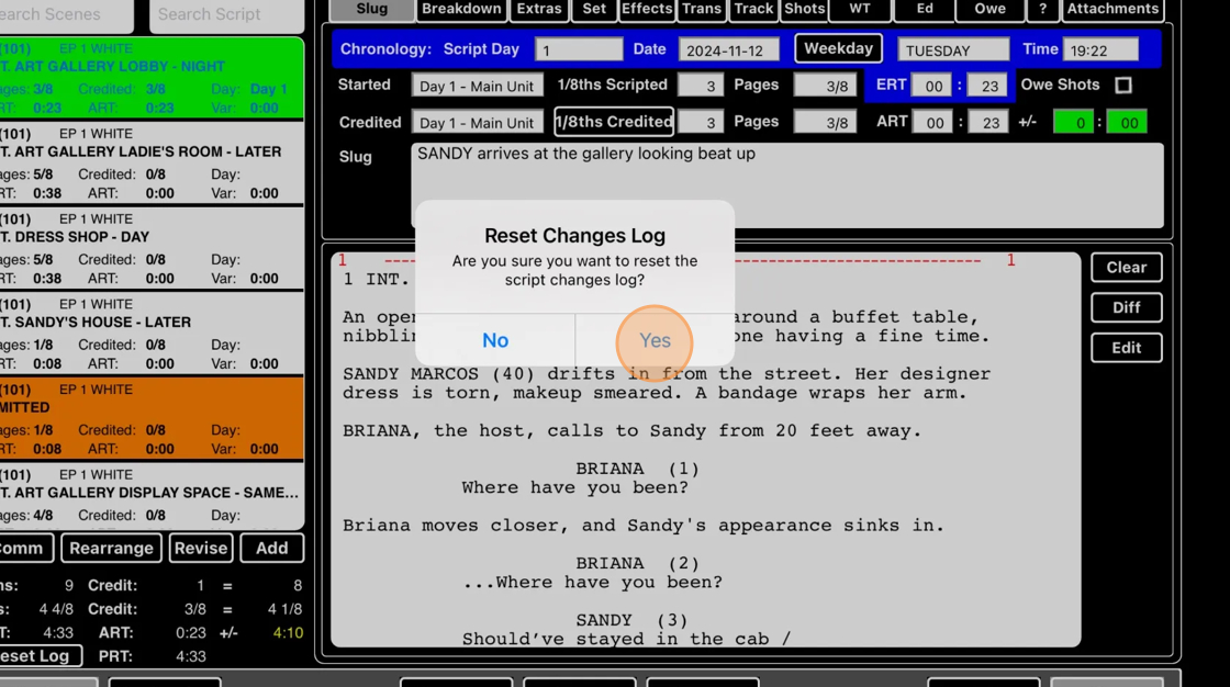 Sometimes when you get a script revision, the math for number of scenes, pages and setups in the Daily Progress Report can go off. To fix this, you need to reset the script changes log.