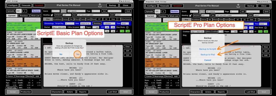 If you are on the PRO PLAN (Annual/Quarterly w/Backup) ScriptE will ask if you want to backup to ScriptE or back up to iPad. \