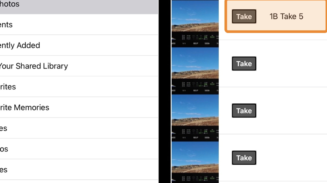 19. Now, 1B take 5 is selected in the top box, and 1B take 4 is selected in the bottom box. Scroll through the middle PHOTOS boxes and click on photos to compare them.