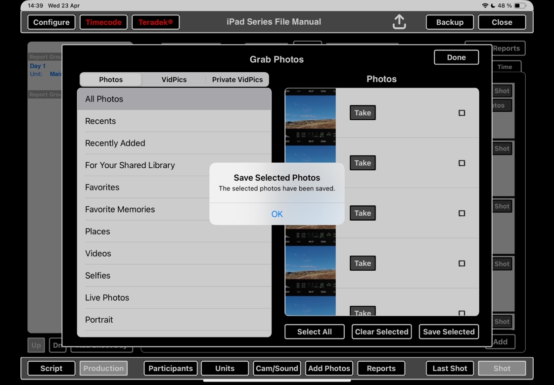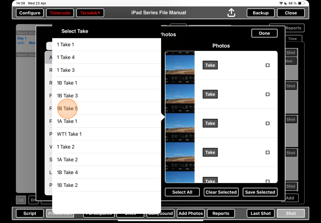 Tip: If you take screen grabs while a take is rolling, ScriptE will automatically know which take the photo belongs to.