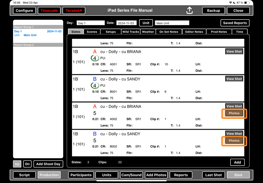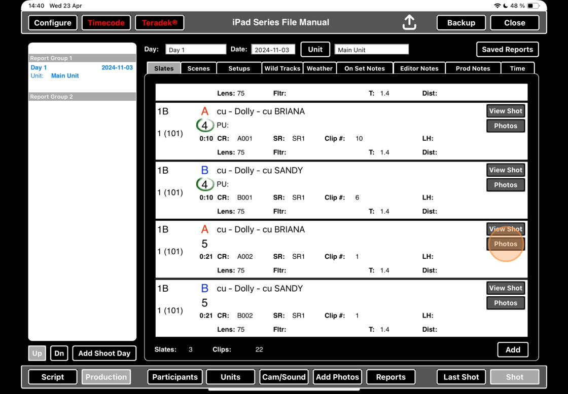 15. Scroll to find a take with photos. Click on the PHOTOS button.