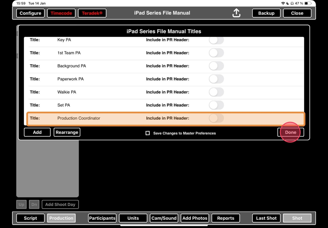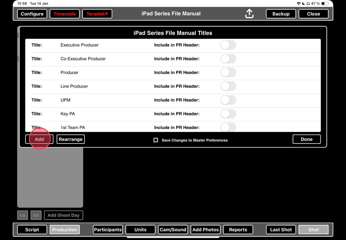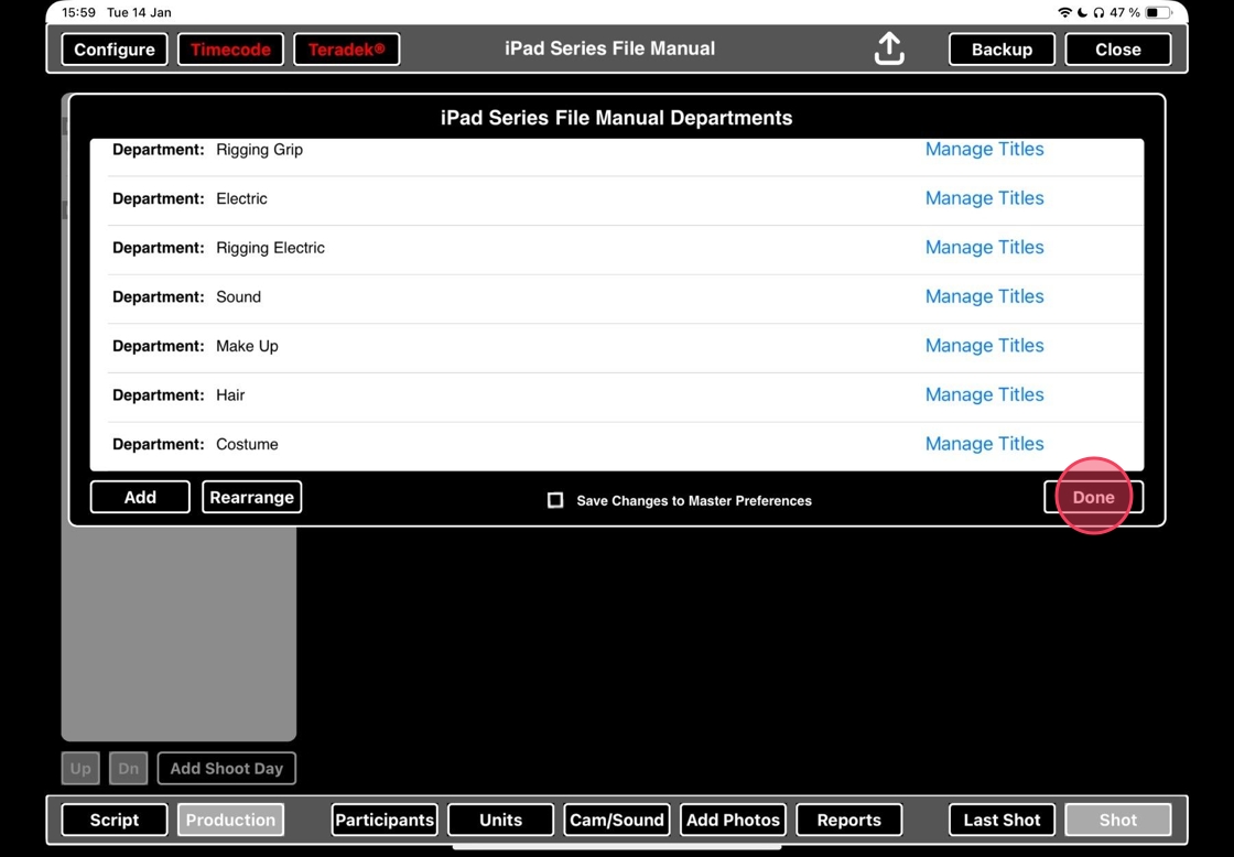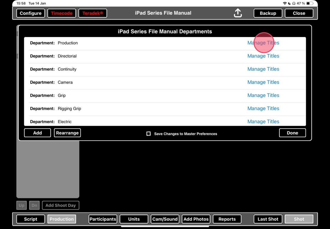 16. In the Departments Menu, locate the department you want to add the title to. Tap MANAGE TITLES to open the Titles Menu.