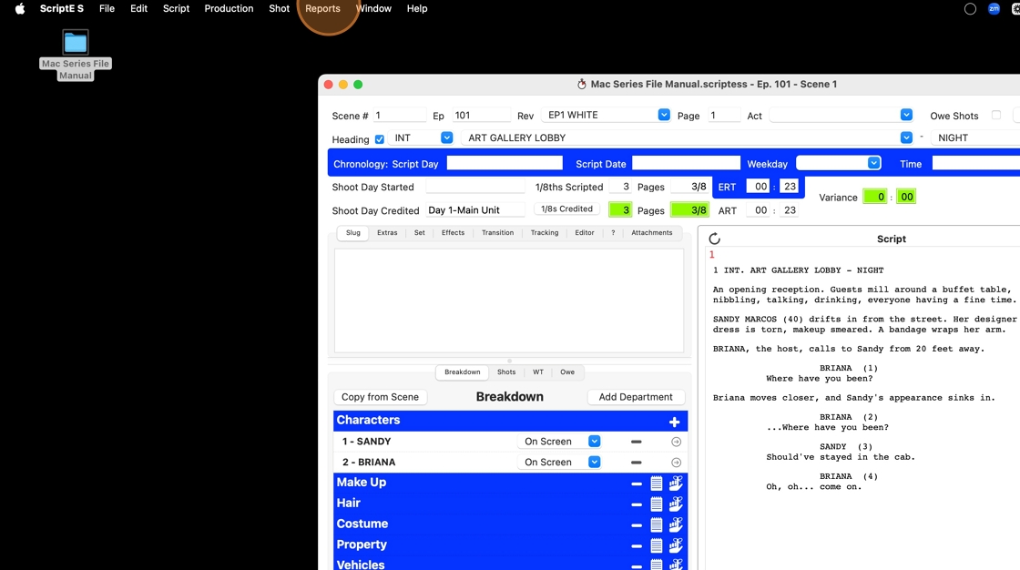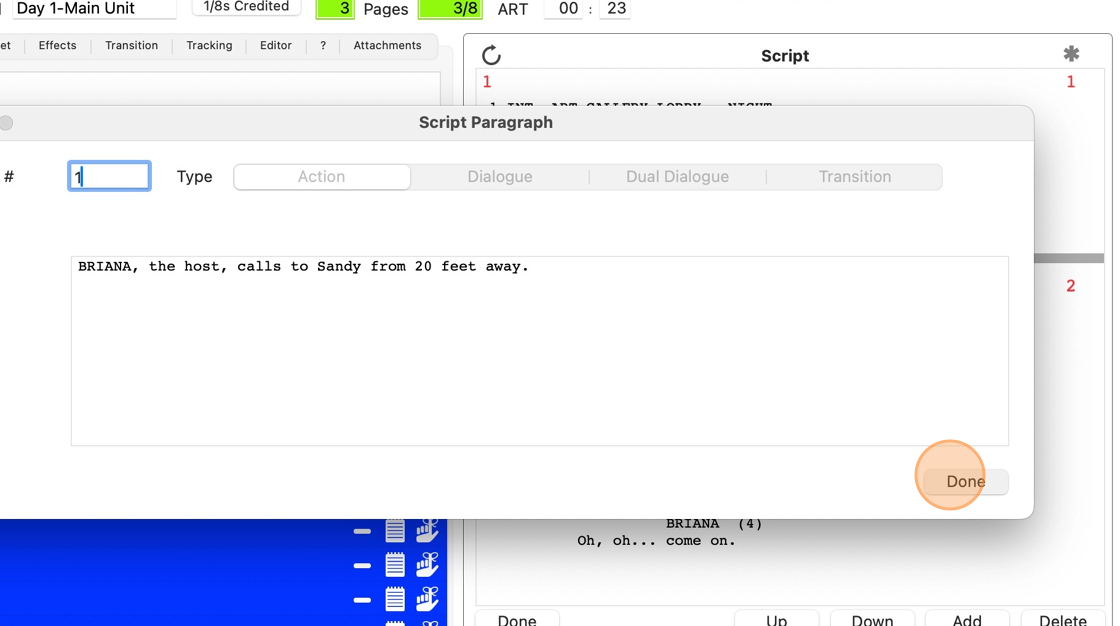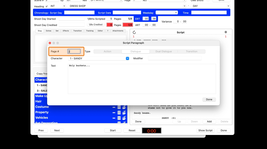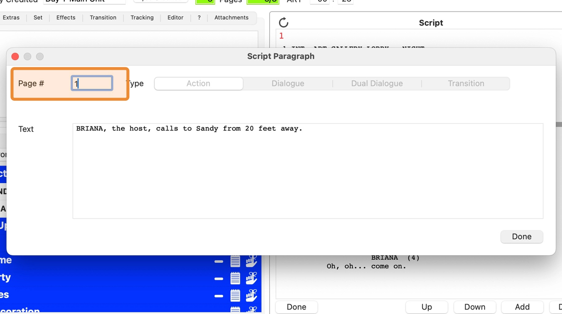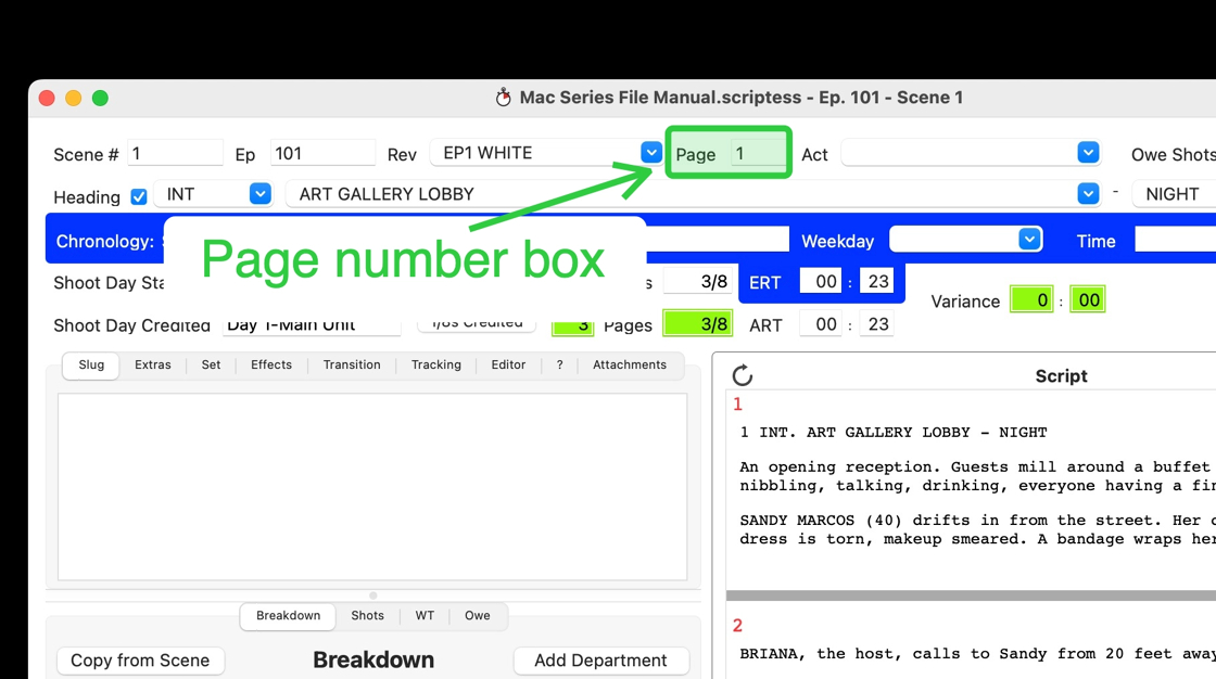 The number in the page box indicates which page the the scene header (INT/EXT. LOCATION - D/N) with be printed on.