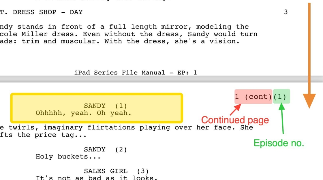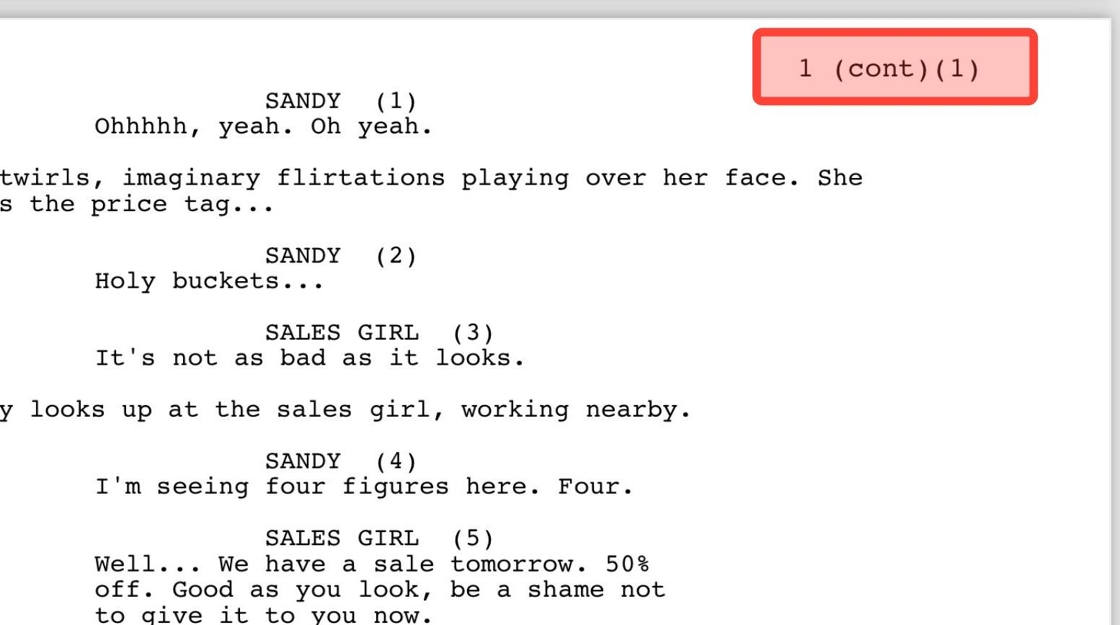 10. If you have too many paragraphs on the same page, ScriptE will print continued pages.