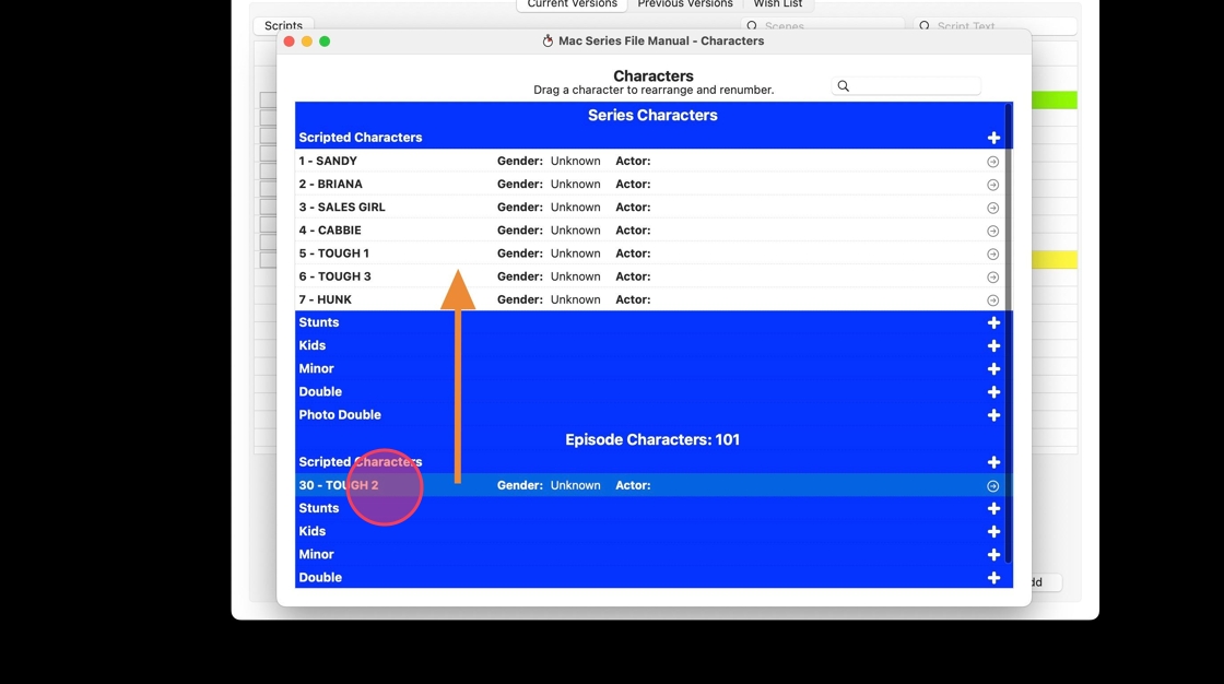 4. Click on the character and pull them up to series character. A thin blue line will appear between characters in the list - that is where your character will be placed. The blue line is easiest to see if you place it between two characters.